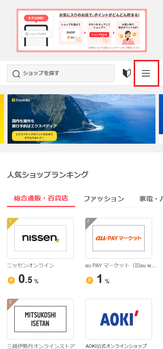 「メルペイモール」内のTOPページの上部にあるメニューアイコン(左画像赤枠)を選択します。