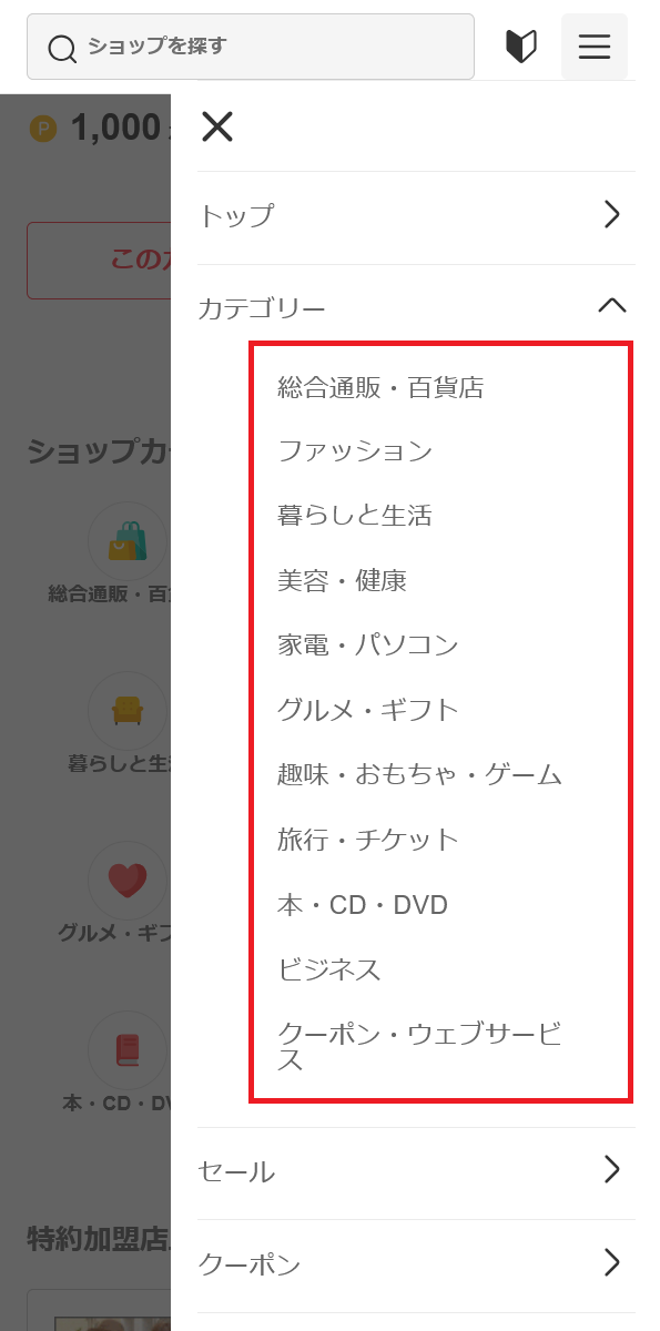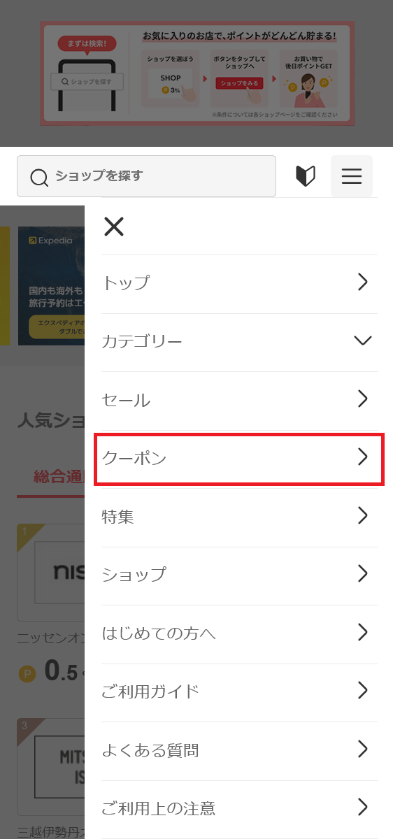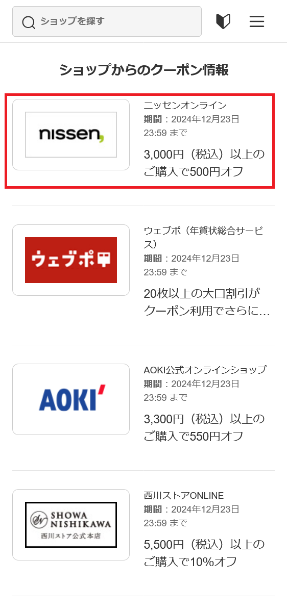- ショップのクーポンとは、各ショップが独自に発行しているクーポンです。詳細は各ショップの詳細ページをご確認ください。