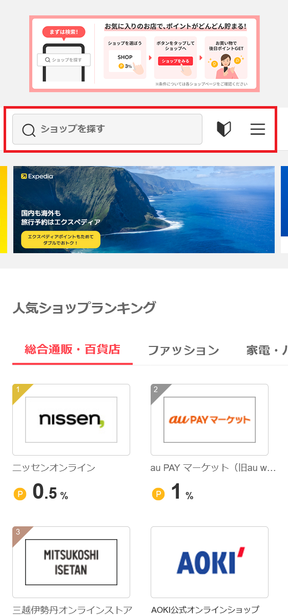 画面上部にある検索窓からショップ名を入力し、ショップを検索することができます。