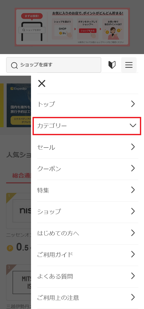 ・「メニュー>カテゴリー」を選択、カテゴリーを指定して検索ができます。