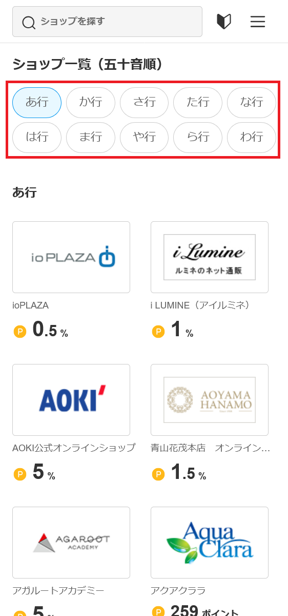 「メニュー>ショップ一覧」を選択、ショップの頭文字から検索ができます。